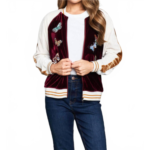 [US] PAPARAZZI embroidered velvet baseball jacket in wine