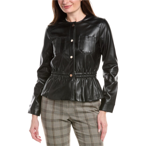 - Elastic Detail Waist Jacket In Noir With Faux Leather, Dual Chest Pockets, Snap Cuffs, And Peplum Hem