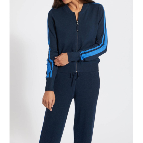 A jacket so versatile you can literally wear it with anything.Elevate your off-duty style with the Tokyo Track Jacket by LEIMERE, crafted in a cozy mix of 50% Modal, 25% Viscose, 15% Nylon, and 10% Cashmere. This imported navy jacket features a mockneck and long sleeves, perfect for fall travel occasions. The zip closure and practical pockets add functional charm, while the contrast stripe enhances its athletic appeal. For care, hand wash and lay flat to dry or opt for a gentle machine wash with like colors and tumble dry low. Model is 5'10' and wears a size small (36.5' chest, 21' length).