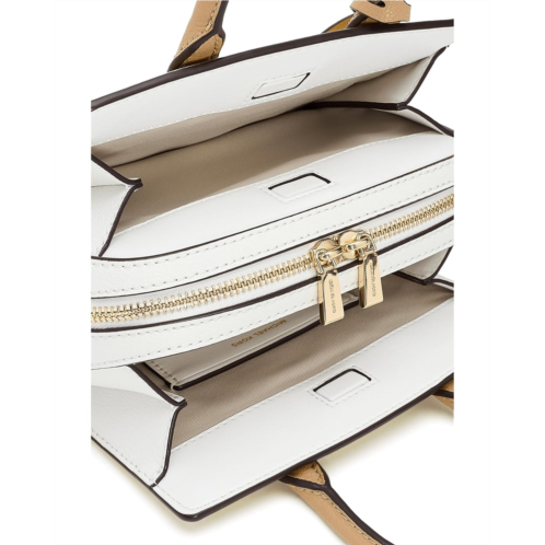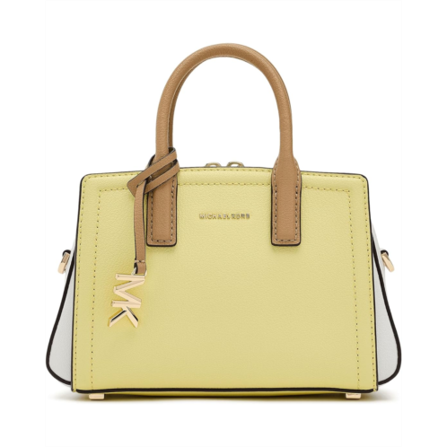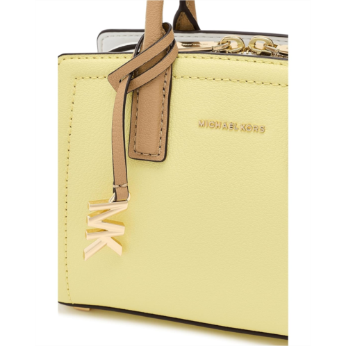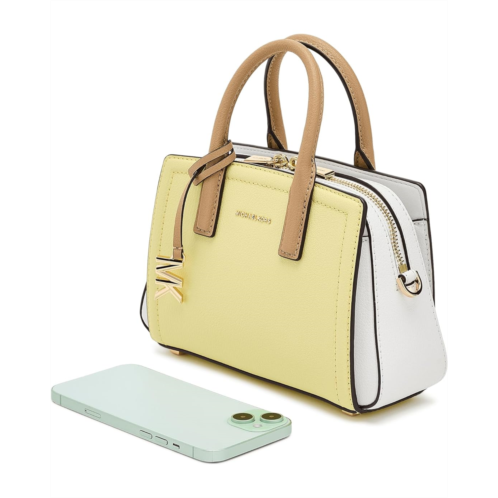 - The MICHAEL Michael Kors Laila Extra Small Crossbody blends sophisticated design with practical versatility. Crafted with durable leather material, this compact bag features dual top handles and a removable, adjustable shoulder strap with buckle detail for multiple carrying options. Gilded hardware adds a refined touch, while protective metal feet help keep the bag elevated and secure.