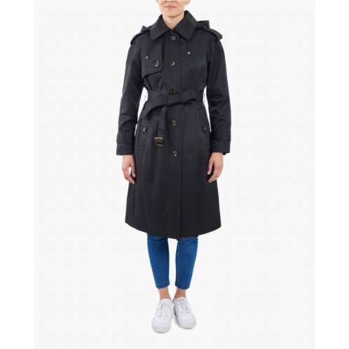 The coolest, most versatile utility jacket. Match it with your favorite pair of denim or throw it over any day dress.Elevate your outerwear collection with the London Fog Single Breasted Belted Raincoat with Hood, designed for cool, rainy days. This black utility jacket features long sleeves and is crafted from a cotton blend with 100% polyester lining, ensuring water resistance and comfort. The design boasts a removable hood with drawstrings, single breasted button closure, and a tie front for a customizable fit. Care for this versatile raincoat easily with machine wash and tumble dry instructions, perfect for travel and seasonal transitions.