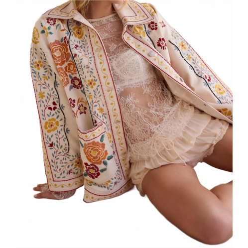 A casual yet cool jacket that every closset needs.Introducing the Avery Embellished Jacket by Free People, a Floral patterned masterpiece in Pearl Ivory. Crafted with long sleeves from 100% cotton, this slightly structured piece boasts a garment length of 31 inches and is perfect for layering. Designed in an oversized silhouette with a drop-shoulder and button-front closure, it features practical patch pockets for added versatility. Origin - Imported. Care - Dry clean only.