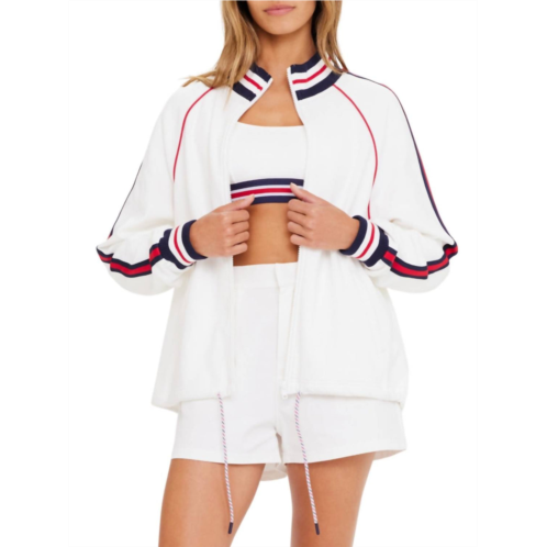 Giving off a vintage vibe, we love this varsity jacket style.Introducing the Love Morgan Jacket by The Upside, a chic addition to your casual wardrobe in sleek white. This varsity jacket features long raglan sleeves with striking stripe knitted tape and an embroidered arrow logo that adds a sporty touch. Crafted from organic cotton pique and fully lined, it includes practical zip pockets and an adjustable drawcord hem for a comfortable fit. Originating from China, it offers a convenient zip closure and care instructions suggest machine wash and line dry.