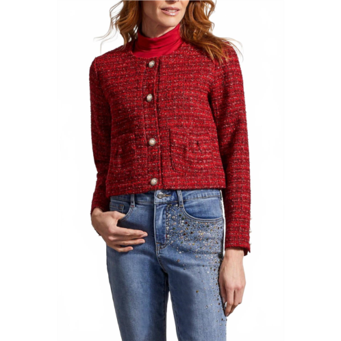 A jacket so versatile you can literally wear it with anything.Enhance your wardrobe with the Cropped Tweed Jacket by TRIBAL, a chic addition for a touch of sophistication. This casual jacket in vibrant red features long sleeves and is crafted from 90% polyester and 10% wool. Its standout design includes faux pearl front buttons with gold trim, three functional sleeve cuff buttons, two stylish pleated accent front pockets, and a button-up collar-free neckline. Closure - Button closure.