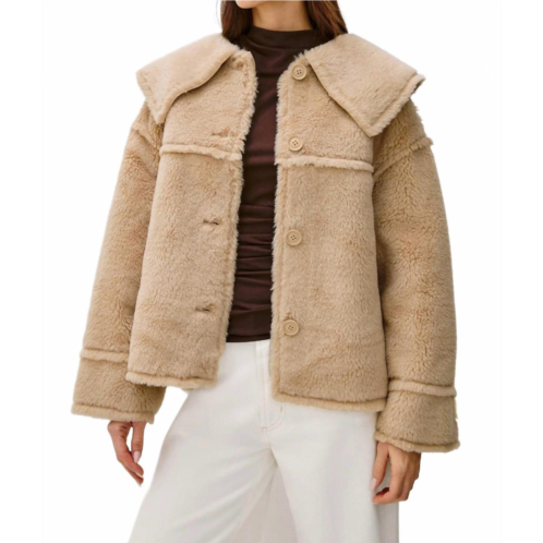Bundle up in this adorable teddy jacket that'll have you wishing for colder temps.Meet the Wesson Jacket by Rails, a stylish teddy jacket crafted for both comfort and elegance. With its cozy faux shearling, this jacket boasts long sleeves, a wide shawl collar, and a cropped, boxy fit in a solid beige hue. It is made from a blend of 70% polyester and 30% wool, and features a classic button closure with seaming details throughout. Expertly crafted, this piece is imported for timeless appeal.