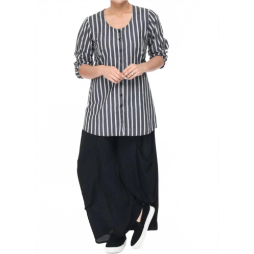 A casual yet cool jacket that every closset needs.Discover the Ivy Jacket by Tulip Clothing, a staple casual piece in Rothschild Stripe that's perfect for any season. This three-quarter sleeve jacket is crafted from 100% cotton and features a scoop neckline with a flattering bracelet length. Designed with a Mother of Pearl button closure, practical front pockets, and a decorative back pleat with a tab and buttons, it offers both style and utility. Care is easy with machine wash and line dry instructions. Model is wearing size small.
