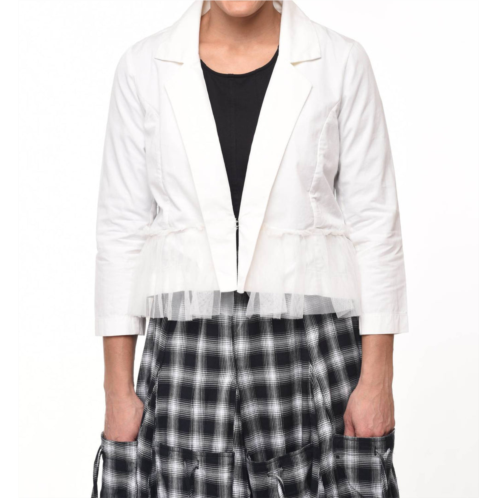 Cute, casual, and comfortable. This jacket is a must have.Introducing the Julianna Jacket by Tulip Clothing, a chic piece for those seeking quiet luxury. This casual, three-quarter sleeve jacket in ivory twill features a collared neckline with elegant princess seams and mesh embellishments. Made from 100% Cotton Twill, it offers a perfect fit across sizes with garment lengths varying from 20' to 22.5'. Closure - Hook and eye closure. Perfect for an evening event or a stylish New Year's Eve look.