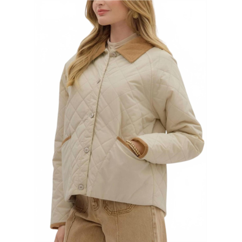 A casual yet cool jacket that every closset needs.Introducing the Bar Harbor Jacket by Entro, a chic addition to your wardrobe perfect for fall travel. The sand-colored jacket features a solid diamond pattern with long sleeves and a contrast collar for added style. Made with a woven, lightweight fabric, this jacket offers front pockets and a button closure to combine practicality with fashion. It's lined for comfort and is designed as a non-sheer, textured piece, ensuring you stay cozy and stylish.