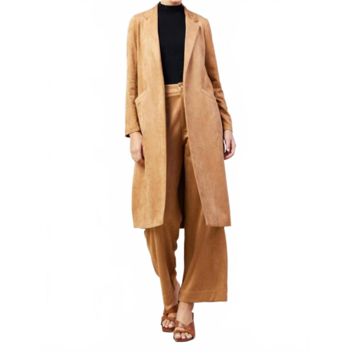 A timeless classic. You'll be reaching for this trench every season.The Bethany Duster Jacket by SKIES ARE BLUE is a stylish addition to your fall wardrobe with its long sleeves and vintage-inspired design. Crafted from a soft blend of 92% Polyester and 8% Spandex, this brown faux suede duster features functional pockets and a button closure for practicality. Ideal for Thanksgiving travels, this solid-colored trench coat ensures elegance and comfort. Care for this piece is simple with machine wash instructions.