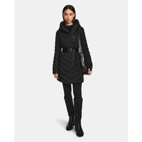 Elevate your winter wardrobe with the women's knee-length quilted down puffer, designed with a modern matte stretch shell. The asymmetrical two-way zipper adds an eye-catching detail, while the deep hood with an extra toggle closure ensures optimal warmth. Featuring stylish vegan leather trims and a removable belt, this puffer offers a sleek, fitted silhouette. Storm cuffs provide added protection against the elements, and the RDS-certified down fill delivers exceptional insulation without bulk. Perfect for the fashion-forward woman, this jacket combines practicality with elegance, making it an essential piece for stylish winter outings