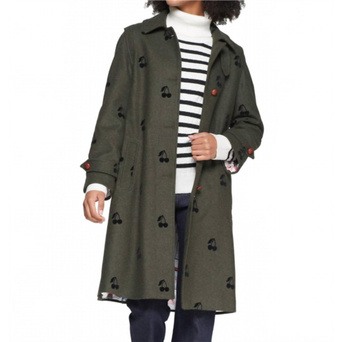 The perfect trench coat that you can throw over any outfit.Introducing the Cherry Print Coat by Vilagallo, a charming piece in olive green that's perfect for embracing the boho chic trend this fall. This women's graphic patterned trench features long sleeves and a traditional collar. Crafted from a wool blend (65% Wool, 27% Polyamide, 5% Others Threads, 3% Elastane) and designed with convenient pockets, it secures with a button closure. Ideal for vacation and Thanksgiving occasions, this coat effortlessly combines style and function.