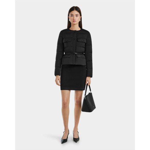 The FRANCESCA by RUDSAK is a lightweight quilted puffer jacket that redefines sophisticated style in outerwear. Insulated with RDS-certified down and feather fill, it provides warmth without bulk. Its cropped, collarless design and thin removable vegan leather belt create a sleek, cinched silhouette, while flap-front pockets and a snap button closure add functional elegance. Perfect for layering, the FRANCESCA effortlessly combines practicality and refined design for a polished look on cooler days.