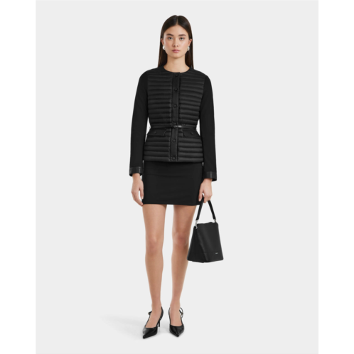 The LINA by RUDSAK is a women’s quilted lightweight down jacket that redefines elegance in outerwear. Featuring a round collar and a snap-up front, it’s detailed with tonal contrast material sleeves and vegan leather accents at the cuffs for a polished finish. A thin removable vegan leather waist belt and pocket flaps add subtle sophistication. Insulated with RDS-certified down, the LINA offers light warmth with a sleek silhouette, making it the perfect dressy layering piece.