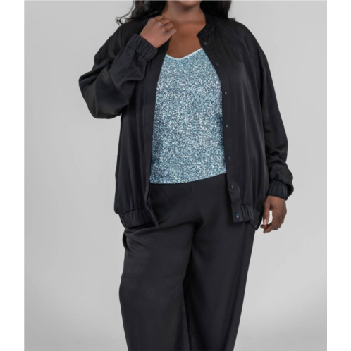 A riff on your favorite classic bomber jacket.A beautifully draped bomber style that effortlessly complements any ensemble. This long sleeve jacket in classic black features a crewneck and convenient pockets, making it both stylish and practical. Crafted from durable polyester, it secures with a button closure for easy wear. Hand wash and lay flat to dry.