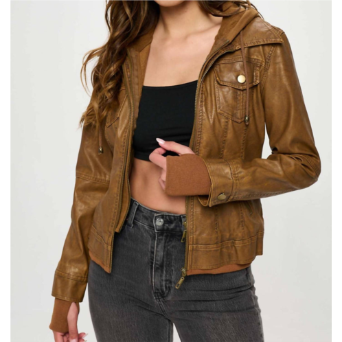 Soft leather, impeccable design. This leather jacket is a win-win.Stay stylish with the Vegan Leather Bomber Jacket by Coalition LA in a sophisticated camel color. This women's jacket features long sleeves and is made from 100% Polyurethane, ensuring a sleek leather look with a modern edge. Designed with a removable hood for versatility, it has a dual front zip closure and side entry zip pockets for functional flair, while thumbhole cuffs provide extra warmth. Ideal for travel or Thanksgiving gatherings, this jacket fits true to size, hitting just at the hip for a flattering silhouette.