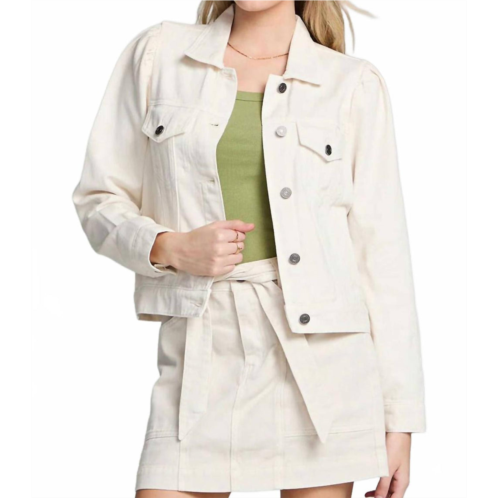 The perfect jean jacket for those slightly crisper days between seasons.Introducing the Hyland Denim Jacket by Saltwater LUXE, a must-have for any minimalist wardrobe. This women’s jacket, in a sophisticated Salt hue, features long sleeves and is crafted from 100% cotton denim, perfect for your spring travel needs. The jacket boasts a solid pattern with a and wearing size small.