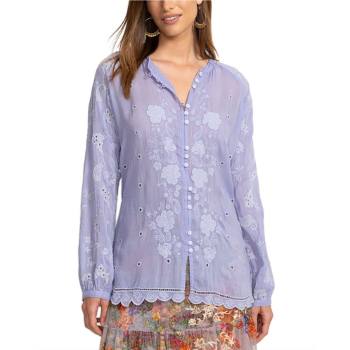 Introducing the Johnny Was Petite Anzhelina Tunic, a boho-chic addition to your wardrobe. This tunic in Persian Violet features gathers at the neckline, eyelet bishop sleeves, and a decorative scalloped hemline for a vintage-inspired look. The button front adds a touch of elegance, while the 100% cupro fabric ensures a soft and luxurious feel. Machine wash cold for easy care. Embrace the eclectic, boho vibes of Johnny Was with this unique and stylish tunic. Add it to your collection today!