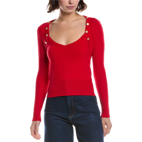 Introducing the L'AGENCE 2pc Nara Tank & Shrug Set, a stylish and versatile addition to any woman's wardrobe. This set comes in a beautiful Scarlet Red color, with button accents for added flair. The tank measures approximately 21 inches from shoulder to hem and is made of a luxurious blend of nylon, viscose, polyester, cashmere, and spandex. The model is 5'9' and is wearing a size small. Perfect for a night out or a special occasion, this set is a must-have for the fashion-forward woman. Dry clean only. Imported.