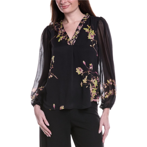 - Printed Top In Rich Black With V-Neck, Puff Sleeves, And Elastic Cuffs