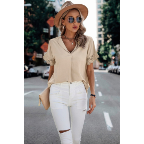 [US] TRUEDAMES solid lace trim sleeve v neck fit blouse