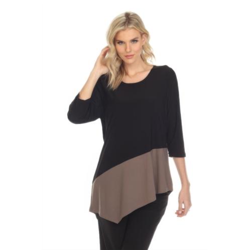 This quarter sleeve top combines bold color blocking with a flattering V-neckline for a sleek, contemporary look. Crafted from soft stretch fabric, it offers a comfortable fit that maintains its shape throughout the day. Designed for effortless versatility, it transitions seamlessly from casual to dressy settings. Perfect for pairing with jeans, trousers, or skirts for a polished finish.