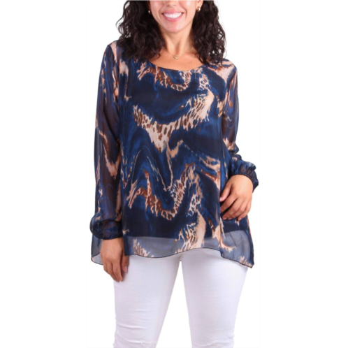 A timeless blouse that will never go out of style.Elevate your wardrobe with the Ravena Blouse by GIGI MODA, a long sleeve kaftankorea piece adorned in a sophisticated leopard wave print. This navy blouse features a scoopneck and elastic wrist cuffs, delivering both comfort and style. The exterior is crafted from 30% silk and 70% viscose, while the soft jersey lining is made from 95% viscose and 5% elastic. Proudly made in Italy with a pull-on closure, this blouse combines boho chic flair with effortless elegance, perfect for a cocktail party or Hanukkah celebration.