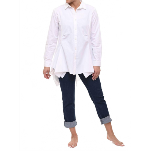 A classic button down shirt that will never go out of style.Introducing the Mia Button Down Top by Tulip Clothing, a chic addition to your winter wardrobe. Crafted from 100% cotton, this women's shirt features a unique asymmetrical design with front and back pleats, complemented by convenient pockets. The button closure and traditional collar add a touch of classic elegance. For best care, machine wash and line dry this versatile piece. Model is wearing size small.
