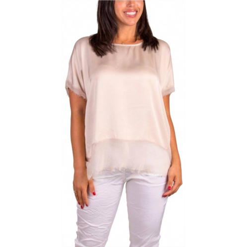 The short sleeve tee you'll want in every color.Elevate your style with the Turin Silk Top by GIGI MODA, a minimalist piece perfect for a summer dinner party. This women's top features a crewneck and raw edge short sleeves, exuding understated elegance in solid beige. Crafted from a luxurious blend of 30% silk and 70% viscose with an interior of 95% viscose and 5% elastic, it offers a comfortable pull-on fit. Made in Italy, this top is best maintained with a gentle hand wash.