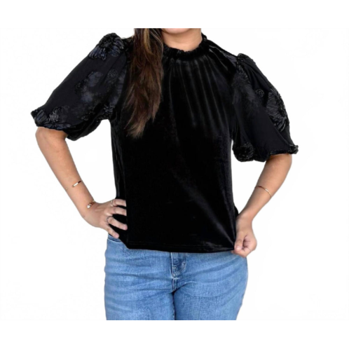 Pair this with your favorite jeans and slides for your next girls night out.Introducing the Floral Embroidered Puff Sleeve Velvet Top by THML, the perfect addition to your holiday wardrobe. This stylish blouse, in a classic black, features short puff sleeves crafted from a luxurious blend of 92% Polyester and 8% Spandex. Its pull-on style is enhanced by delicate floral embroidery, giving it a touch of personality while maintaining versatility. Made for easy care, simply machine wash and wear for your next festive gathering.