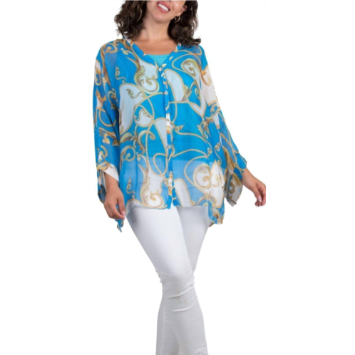 Pair this with your favorite jeans and slides for your next girls night out.Experience luxury with the Angelo Baroque Silk Blouse by GIGI MODA, a statement piece in vibrant turquoise. This blouse boasts long dolman sleeves and a stunning gold baroque print, offering a sophisticated touch to any ensemble. Crafted from 100% silk on the exterior with a viscose-elastic blend interior, it features a stylish V-neck and is finished with a button closure. Made in Italy and designed to be dry cleaned, this one-size-fits-all blouse perfectly complements holiday parties or workwear occasions. Model is 5'7'.