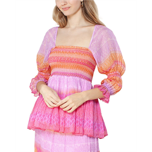Introducing the Hale Bob Smocked Top, a stylish addition to your wardrobe that embodies the brand's signature colorful femininity with a nod to boho style. This pretty pink smocked top measures approximately 19 inches from the shoulder to the hem, making it the perfect piece for pairing with your favorite bottoms. Made from 100% viscose, this top is recommended to be dry cleaned only. Imported for your convenience, this Hale Bob Smocked Top is a must-have for any fashion-forward woman.