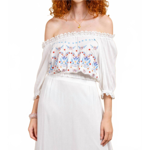 [US] PAPARAZZI embroidered rayon crinkle peasant top in white