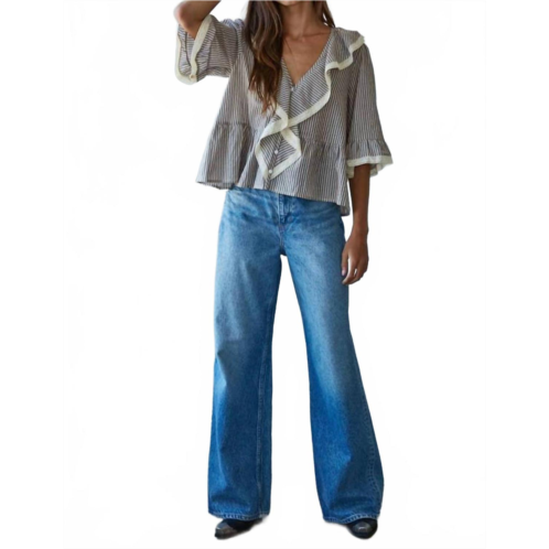 A versatile blouse that works from desk to dinner!Introducing the Ruffle Top by By Together, perfect for spring getaways with a touch of 90s fashion flair. This women's blouse features three-quarter sleeves and a charming striped pattern that enhances its grey cotton blend fabric. Designed with a collar and v-neckline, it adds a sophisticated touch, while the ruffle detail elevates the look. Closure - Button closure. Care - Hand wash and line dry for best results.