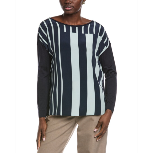 Introducing the Akris Silk Top, a luxurious addition to your wardrobe. This stylish blouse features a navy and verdigris color/pattern, with a high-low hem design for a modern touch. Made from 100% silk, this top is perfect for both casual and formal occasions. The top measures approximately 27 inches from shoulder to hem and is worn by a model who is 5'10 and wearing a size 4. Please note that measurements may vary slightly by size. For care instructions, this top is dry clean only and imported for your convenience. Elevate your outfit with the Akris Silk Top today.
