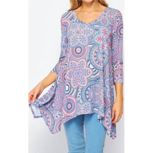 A timeless blouse that will never go out of style.Introducing the Mandala Sharkbite Top by Honeyme, a stylish addition to any wardrobe with its vibrant purple pattern and unique sharkbite hem. This women’s blouse features three-quarter sleeves and a scoopneck design, perfect for a chic, comfortable look. Crafted from 96% polyester and 4% spandex, this top offers a flexible fit. With a convenient pull-on closure, this piece is both practical and fashionable.