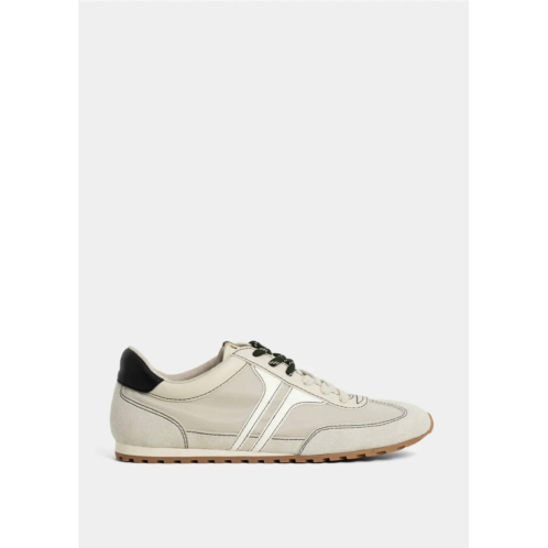 When fashion and function come together seamlessly.Elevate your off-duty days with the Women's Sarah Sneaker by SHU SHOP, blending a minimalist and nostalgic vibe in beige. The sneaker boasts an upper made from a mix of neutral faux suede and synthetic materials, accented with contrast stitching and a black faux leather heel tab. It secures with beige cotton laces and features a soft padded interior lining, ensuring comfort with every step. The lightweight gum rubber outsole offers excellent traction, perfect for summer vacation strolls. With a medium width and flat heel, this sneaker is true to size and ideal for versatile, casual occasions.