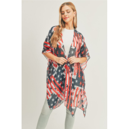 The American Flag Kimono features a bold red, white, and blue flag print that blends comfort with standout style. Crafted from lightweight polyester, it offers a breezy silhouette ideal for layering over tanks or swimsuits during summer celebrations. Designed for versatility, it transitions seamlessly from beachwear to casual daytime outings.