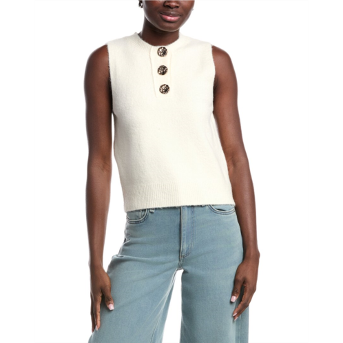 Introducing the 'ANNA KAY Samya Sweater Vest' for women, a stylish and versatile addition to your wardrobe. This ecru colored vest features ribbed trim, a crewneck, and a button placket for a chic look. Made from 100% viscose, this vest is both comfortable and easy to care for with machine washable instructions. The Samya Sweater Vest measures approximately 21 inches from shoulder to hem and is available in multiple sizes. Designed in France, this vest is a must-have for adding a touch of elegance to any outfit. Model is 5'10 and is wearing a size small. Please note that measurements may vary slightly by size.