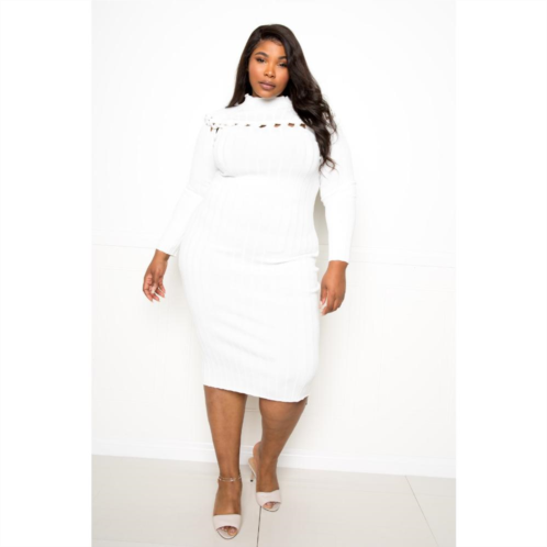 Elevate your winter wardrobe with our Bodycon Sweater Dress with Knot Detail, a chic and cozy piece designed to make a statement. Carefully crafted with attention to detail, this sweater dress seamlessly combines comfort with contemporary style, creating a stunning look for various occasions.Key Features - 1. Fabric - Immerse yourself in the luxurious feel of 65% Viscose and 45% Nylon, ensuring a soft and comfortable wear.2. Sizes - Choose from a range of sizes, including 1XL, 2XL, and 3XL, to find the perfect fit that complements your style.3. Design - Embrace the bodycon silhouette with a modern twistknot detailing adds a touch of sophistication to elevate your look.4. Color Options - Opt for the classic and versatile Ivory, creating a statement piece that exudes timeless elegance.5. Cozy Sweater Dress - The viscose-nylon blend provides warmth and comfort, making it an ideal choice for the colder seasons.Product Details - Knot Detail - The knot detailing on the dress adds a contemporary and sophisticated touch, making it a standout piece in your winter wardrobe. Cozy Fabric - The viscose-nylon blend ensures a soft and warm feel against your skin, perfect for staying comfortable during colder weather. Bodycon Silhouette - Embrace the figure-hugging bodycon silhouette for a sleek and modern look.Why Choose Bodycon Sweater Dress with Knot Detail?Embrace the cozy comfort and modern sophistication of our sweater dress. The knot detailing and bodycon silhouette make it a versatile and stylish choice for any winter occasion.Ideal Occasions - Perfect for winter outings, parties, or casual gatherings, this sweater dress is an ideal choice for creating a chic and comfortable look.Customer Reviews - 'Love the knot detail!
