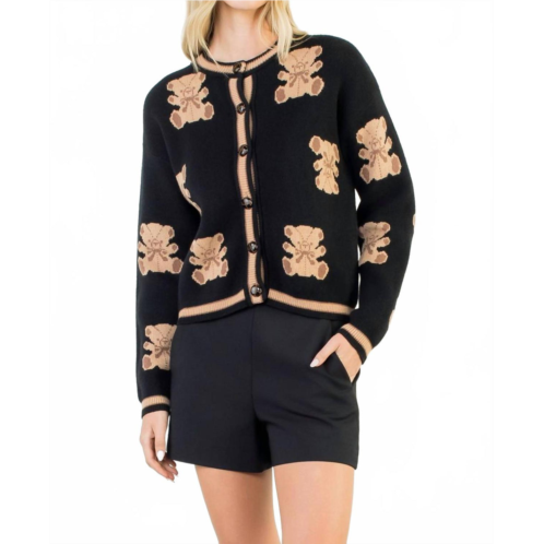 A classic fit that works just as good buttoned as it does left open.Embrace cozy charm with the Teddy Bear Knit Cardigan by THML, an ideal addition to your fall wardrobe. This long-sleeve cardigan features a whimsical black intarsia knit with adorable brown and tan teddy bears, finished with a crew neck and striped ribbed trim. Crafted from 43% viscose, 32% nylon, and 25% polyester, it boasts woven leather buttons for a touch of vintage flair. Closure - Button closure. Care - Machine wash cold and lay flat to dry.