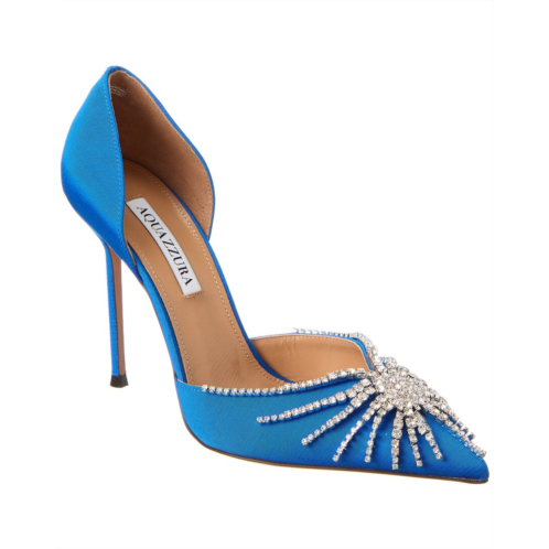 Elevate your look with the Aquazzura Sunshine 105 Grosgrain Pump in Surf Blue. This stunning pump features silver-tone hardware with crystal embellishments, adding a touch of glamour to any outfit. Made in Italy, this pump is crafted with the highest quality materials.The Aquazzura brand is known for its sophisticated, sexy, and fun designs, and this pump is no exception. The lightly padded leather insole provides comfort, while the smooth leather sole ensures durability. With a 4.5-inch heel, this pump is perfect for making a statement wherever you go.Please note that size selections are European, so be sure to reference the size chart for US conversions. All measurements are approximate and were taken from a size 37, so slight variations may occur. Rest assured, our products are 100% genuine, sourced from trusted independent suppliers to ensure authenticity. Add a pop of color to your wardrobe with the Aquazzura Sunshine 105 Grosgrain Pump.