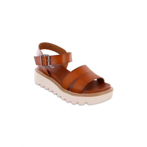 Add a little height with the perfect platform.Step into style with the Women's Jovie Sandal by MIA, crafted in chic cognac faux leather. Featuring an open toe design and a chunky heel, these sandals offer a low heel height of 1.6 inches for comfortable summer wear. Ideal for minimalist, vacation-ready looks, they are perfect for adults seeking fashionable yet practical footwear. Embrace the season with these versatile platforms that effortlessly blend style and comfort.