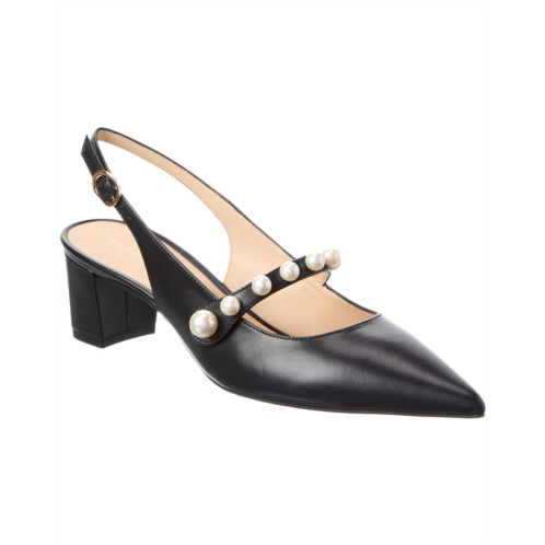 Introducing the Stuart Weitzman Pia Mary Jane Leather Slingback Pump, a stunning addition to your shoe collection. This black leather pump features gold-tone hardware and a pearl-embellished strap for a touch of elegance. The adjustable ankle strap with buckle closure ensures a secure fit, while the lightly padded leather insole and smooth leather sole provide comfort with every step. With a 2.5-inch heel, this pump is both stylish and versatile. Made in Spain, this pump showcases the brand's commitment to artistry and function in women's footwear. Please note that all measurements are approximate and variations may occur. Elevate your look with the Stuart Weitzman Pia Mary Jane Leather Slingback Pump.
