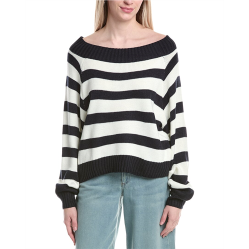 Elevate your sweater game with the WeWoreWhat Off-Shoulder Sweater. This cute and comfortable athleisure piece features an off-the-shoulder neckline and ribbed trim in navy and white. Made of 100% acrylic, this sweater is perfect for staying cozy while still looking stylish. Whether you're dressing it up or keeping it casual, this off-shoulder sweater is a must-have addition to your wardrobe. Hand wash recommended. Imported. Model is 5'9 and is wearing a size small. Measurements may vary slightly by size.