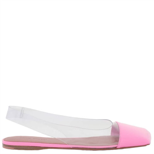 Amina Muaddi Ladies Flats. SKU - ANE GLASS SLINGBACK FLAT-PATENT TRA. Color - Patent Transparent Pvc/Pink. Amina Muaddi Ladies Patent Transparent Pvc/Pink Ane Glass Flats. These slingbacks are crafted from glass PVC and patent leather, featuring a slip-on style, a branded insole, square toe, and a transparent design for a modern, edgy look. Made in Italy.