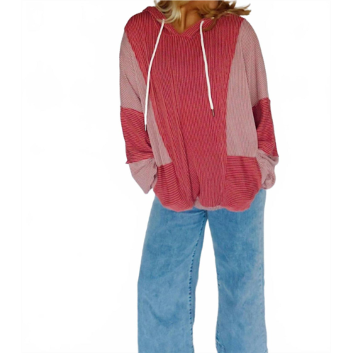 Cooler temps call for layering and we love this adorable sweatshirt for all the obvious reasons.Embrace cozy style with the BiBi Block Ribbed Pullover Jacket in a stunning Raspberry hue, perfect for a holiday party. Crafted with long sleeves and a comforting blend of 76% polyester, 21% nylon, and 3% spandex, this piece promises all-day comfort. It features a hooded neckline and practical pockets, with a convenient pull-on closure. Ideal for lounging or a snug day in, this sweatshirt by BiBi pairs well with any casual wardrobe. Model is wearing a size small and stands at 5'2'.