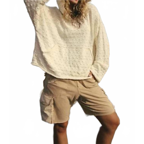 Whether you're running around town or lounging at home, this sweatshirt works for both.Embrace playful comfort with the Lake Sider Hoodie by Free People in charming Marshmallow. This knit oversized hoodie boasts a textured dotted design with practical features like an attached hood and a kangaroo pocket, alongside relaxed drop-shoulder long sleeves. Crafted from 95% Cotton, 4% Polyamide, and 1% Elastane, this pull-on garment measures 22 inches in length and offers a lightweight feel. Care for it gently with a hand wash and lay flat to dry. Bust measurement for size Small is 51 inches, and sleeve length is 18.5 inches.