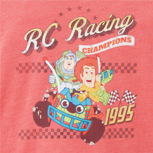 Racing champions, Buzz, Woody, and RC careen down the raceway on thist-shirt celebrating the 1995 release of the firstToy Storymovie. Kids will love the deliberately worn artwork for that fashionably vintage style and heathered jersey knit for a distinct look.