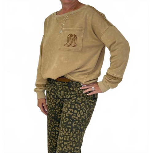 Experience the perfect blend of comfort and style with this trendy crew neck sweater, designed to effortlessly elevate your wardrobe. Pair it with your favorite denim and loafers for the perfect look.Introducing the ee - some Mineral Washed Boot Sweatshirt, a cozy and stylish piece in a rich caramel hue. This women's crewneck sweatshirt features long sleeves and is crafted from 100% Cotton, making it perfect for casual outings. With its unique cowboy boot pocket detail and subtle crochet accents, it effortlessly combines rustic charm and delicate texture. Enjoy easy wearing with its pull-on closure and machine wash instructions.