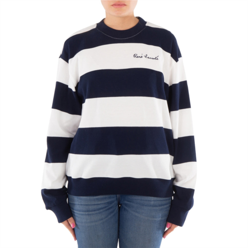 Lacoste Ladies Tops. Fashion category - Hoodies & Sweatshirts. SKU - SF7222-LO-EV0. Color - Multicolor. This shirt features a crew neck, a striped design, a gathered waist detail, and a Lacoste print.100% Cotton